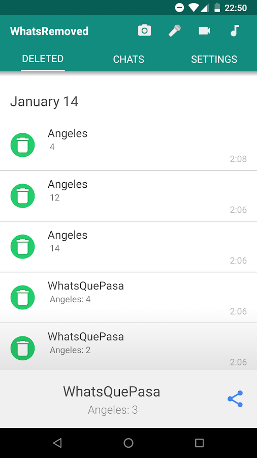 ظهرت عدة طرق لمعرفة الرسائل التي يحذفها المرسل لكنها طرق معقدة قليلا أو تتطلب الروت، لكن سنستعين بتطبيق whatsremoved الذي سيوفر كل الجهد والوقت، ستجد رابط تحميله في آخر تدوينة، التطبيق يضم عدة خيارات كل ما يهمنا هو خانة deleted حيث ستظهر الرسائل المحذوفة: